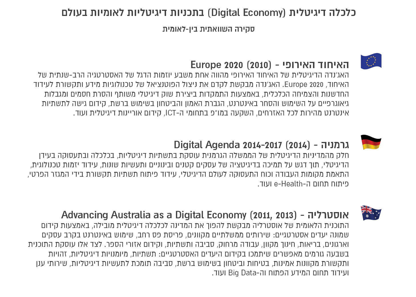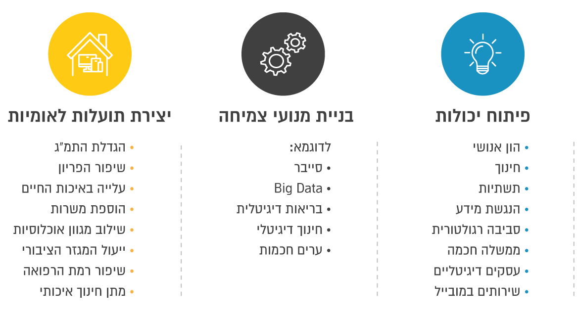 בהתחשב בכך, האתגר העומד בפני מדינת ישראל הוא לנצל את יתרונות הדיגיטציה ליצירת משק חדשני, מתקדם ותחרותי, תוך ניצול יתרונות ה-ICT להעמקת הצמיחה הכלכלית וחדירתה לכלל מגזרי המשק והאוכלוסייה.