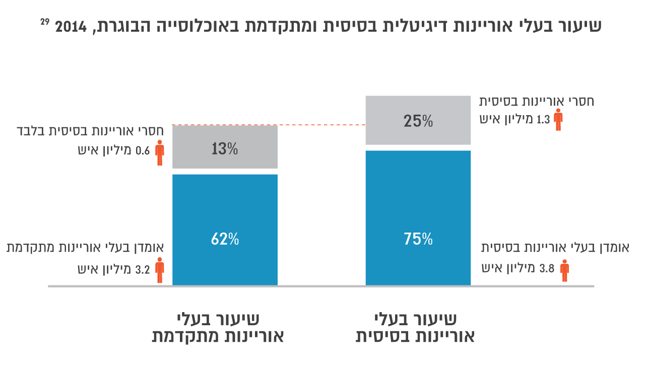 במקביל, על מנת שאזרחי ישראל יוכלו לנצל את יתרונות הדיגיטציה במלואם, יש להבטיח כי כלל האוכלוסייה תוכל לרכוש כישורי אוריינות מתקדמים כדוגמת יכולות מחקר ועיבוד מידע, רכישת מוצרים באינטרנט, בנקאות מקוונת ועוד.